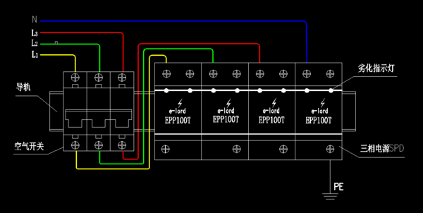 最左边那个根蓝色线不应该出现,因为防雷器下端是连通后接在最右边那个放电模块上的。经过放电模块才能入地的。