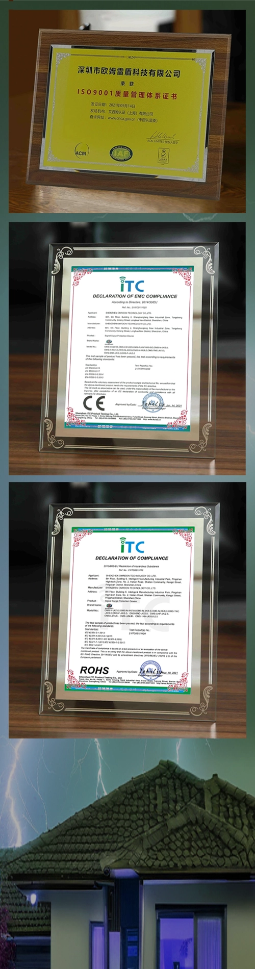 我们已获得ISO9001-2015质量体系认证和SGS、CE、ROHS、FCC 等国际认证,拥有多项实用新型专利及一项发明专利,拥有1000平方自有的生产车间和一批具备多年防雷产品开发经验的工程技术人员,他们凭借精湛的技术和丰富的经验,能够针对客户的不同需求,提供个性化的定制服务,确保每一位客户都能得到满意的产品和解决方案。