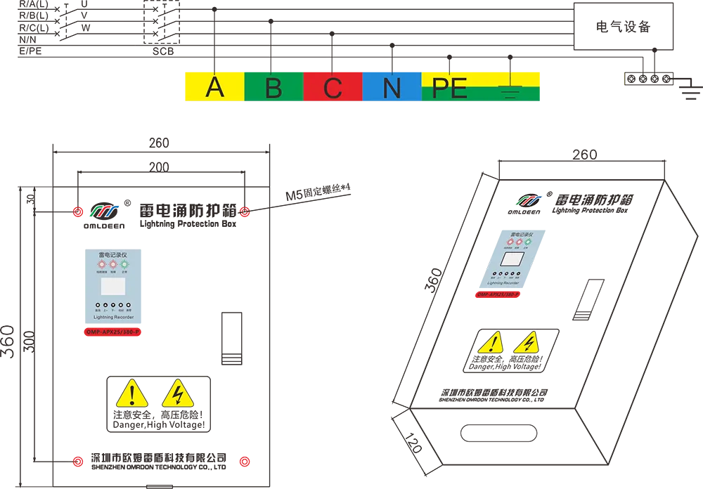欧姆雷盾(OMRDON)T1级单相/三相雷电涌防护箱(Surge Protection Device BOX)适用于交流50Hz/60Hz,380V及以下的TN-S、TN-C-S、TT、IT等供电系统的防雷保护,用于LPZ0A或LPZB区与LPZ1区交界处,其设计依据符合GB18802.11,IEC61643-11技术标准。内置火花间隙防雷保护模块,外箱面板有数显雷击计录仪,记录雷电波冲击次数及日期,具有掉电记忆功能;并有接线正确性及工作状态、故障指示,方便查询及观测。