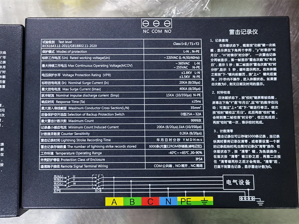 产品严格遵循GB/T18802.11及IEC61643-11等国内外标准,内置失效脱离装置,在模块因过流、过热或老化失效时自动从电网隔离,并伴有红色故障指示灯警示,有效防止因保护器失效引发的二次事故。此外,集成的高精度雷击记录仪可详细记录每次雷击事件的发生时间与次数,LCD屏幕,数据随时查询,为系统运维与雷电风险分析提供可靠依据。