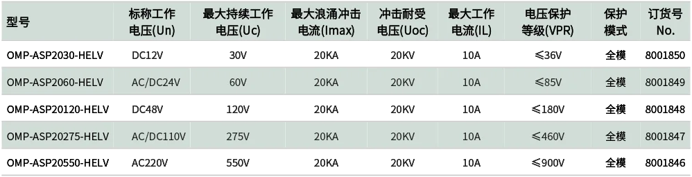 OMP-ASP20550-HELV,超薄外壳7mm,220Vac,Uc550V,20KA,20KV,交流/直流,导轨式高能低残压电源防雷器,接线免拧螺丝