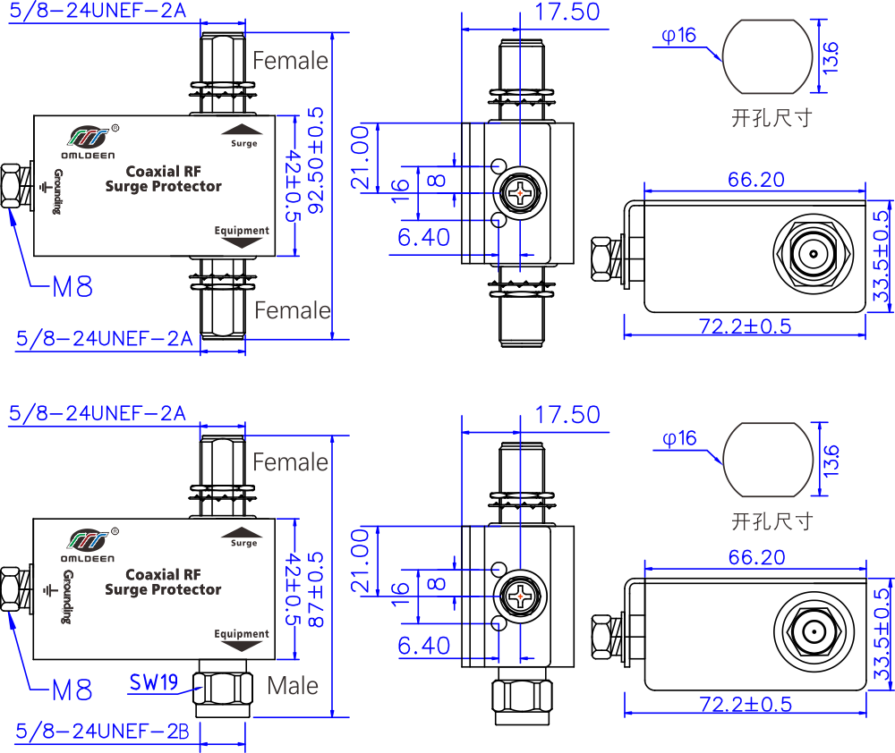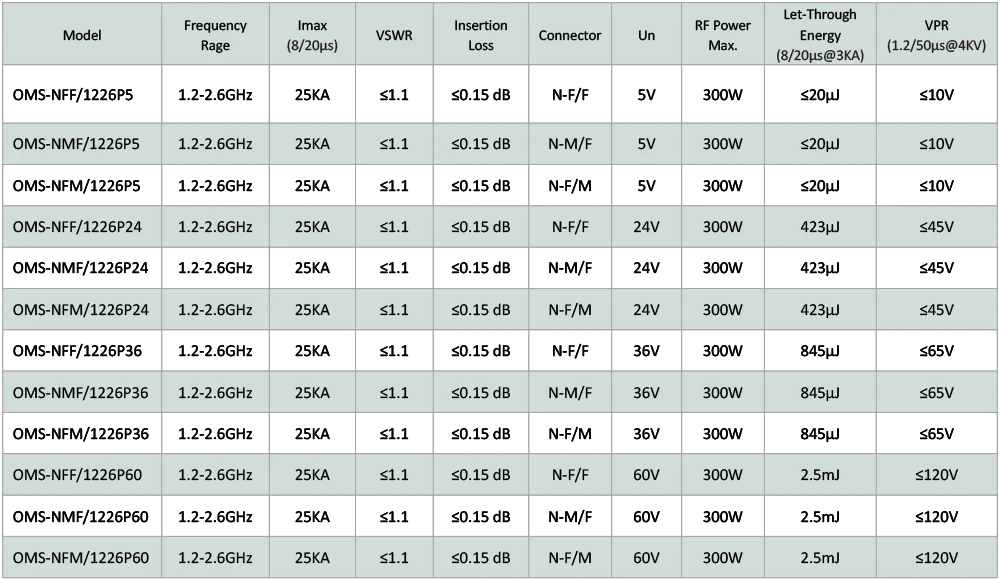 OMS-NMF/1226P5,OMS-NFF/1226P5,OMS-NMF/1226P15,OMS-NFF/1226P15,1200-2600MHz,25KA,DC Pass,5V/15V,GPS天线防雷器,天馈浪涌保护器(天馈线防雷器、基站天线避雷器),偏置馈电型