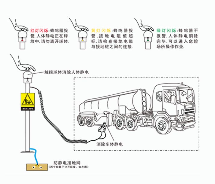 Непосредственно помещенный в зону статической защиты за пределами импорта и экспорта персонала, с рукой, касающейся металлического шара 2-5 секунд, может быть полностью устранено статическое электричество; статическое устранение самого шара оснащено заземляющим проводником, заземляющий проводник двух медных носов должен быть отделен от фиксированного в заземляющем устройстве (как показано на рисунке справа), заземляющее соединение должно быть прочным и надежным, чтобы обеспечить токопроводящий эффект.